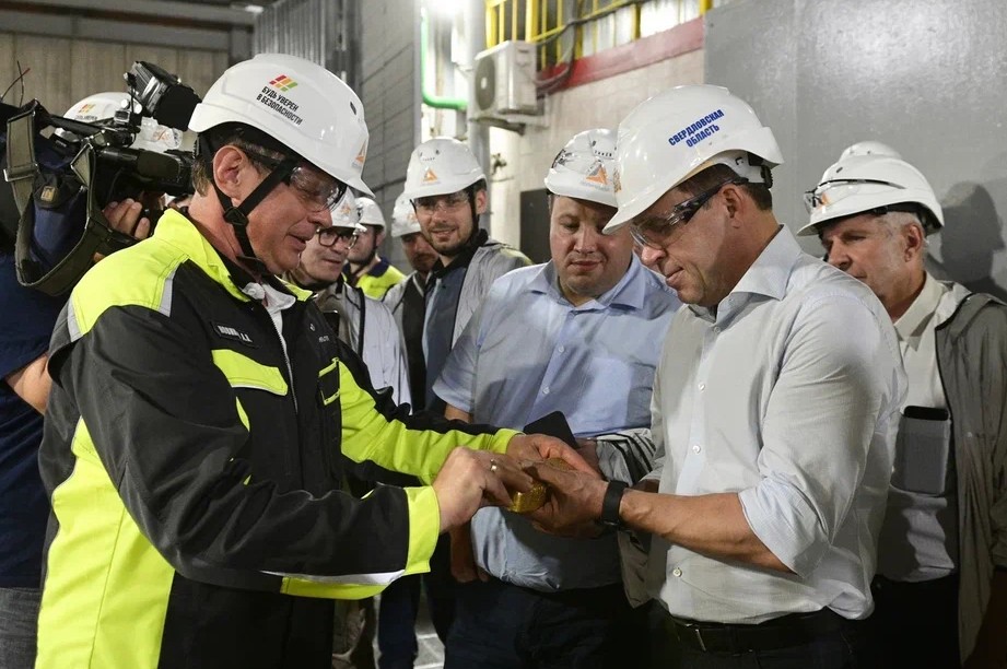Этот золото-серебряный слиток, представленный губернатору, – крошечная часть из 80 тонн металла, которые извлекли из руды на предприятии «Золото Северного Урала» компании «Полиметалл».