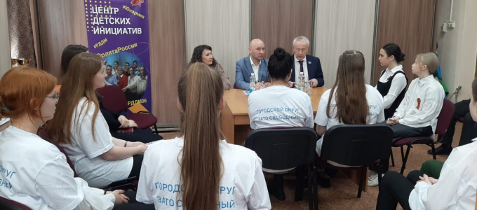 Председатель комитета по социальной политике Вячеслав Погудин вместе с главой городского округа ЗАТО Свободный Александром Ивановым провел встречу с органами молодежного самоуправления муниципалитета - советом молодежи при главе городского округа и советом обучающихся школы № 25 им. Карбышева.