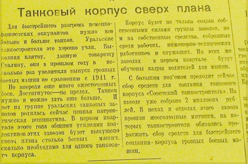 16 января 1943 года в газете «Уральский рабочий» появился материал «Танковый корпус сверх плана», в котором свердловские танкостроители обязались изготовить столько танков и самоходных орудий, сколько требуется для укомплектования армейского корпуса, а также обучить своих же рабочих-добровольцев вождению боевых машин и отчислять часть заработка на оснащение корпуса оружием и обмундированием.
