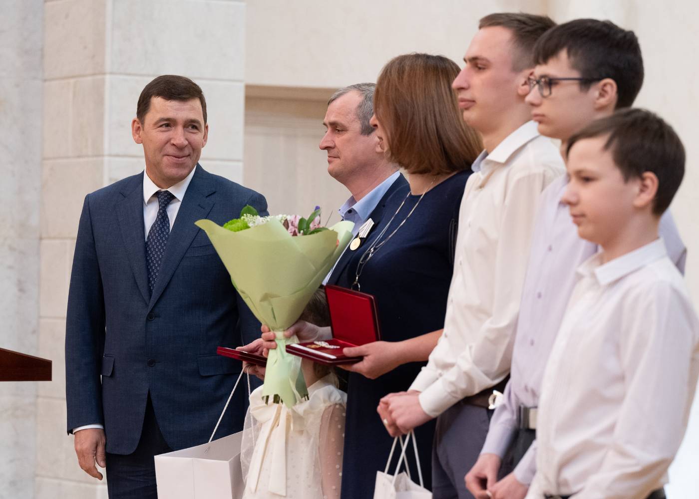 «Всегда с большим удовольствием выполняю эту почетную миссию. И каждый раз с чувством благодарности и признательности отмечаю, насколько многогранны таланты и достижения уральцев. Медалью ордена „За заслуги перед Отечеством“ II степени награждаются работники самых разных сфер: медики, ученые, инженеры, конструкторы и рабочие крупнейших промышленных предприятий нашего региона. С удовольствием вручу награды нашим замечательным деятелям культуры. Также почетными званиями отмечены профессиональные заслуги наших юристов, строителей, экономистов, работников высшей школы», – отметил глава региона.