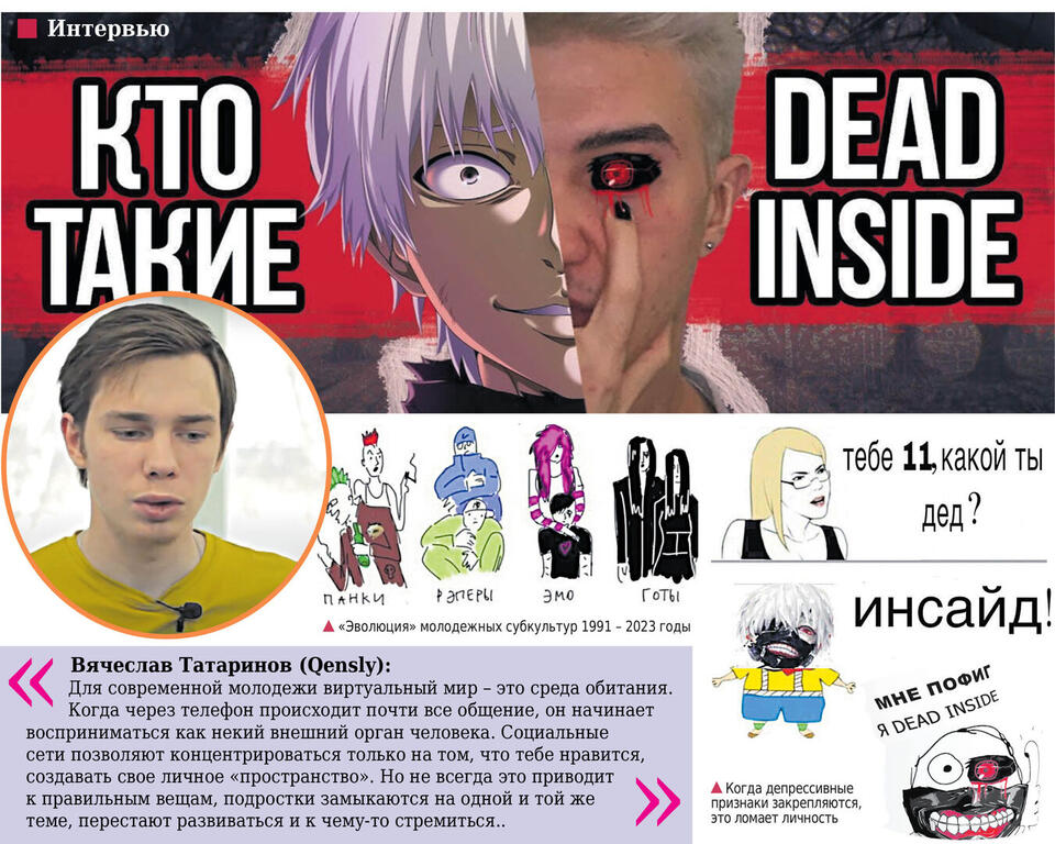 В редакции «Алапаевской газеты» состоялась беседа с алапаевским блогером Вячеславом Татариновым (Qensly), который рассказал об особенностях современных молодежных субкультур и тенденциях, которые набирают обороты в подростковой среде, в частности о поколении «дед-инсайдов»...