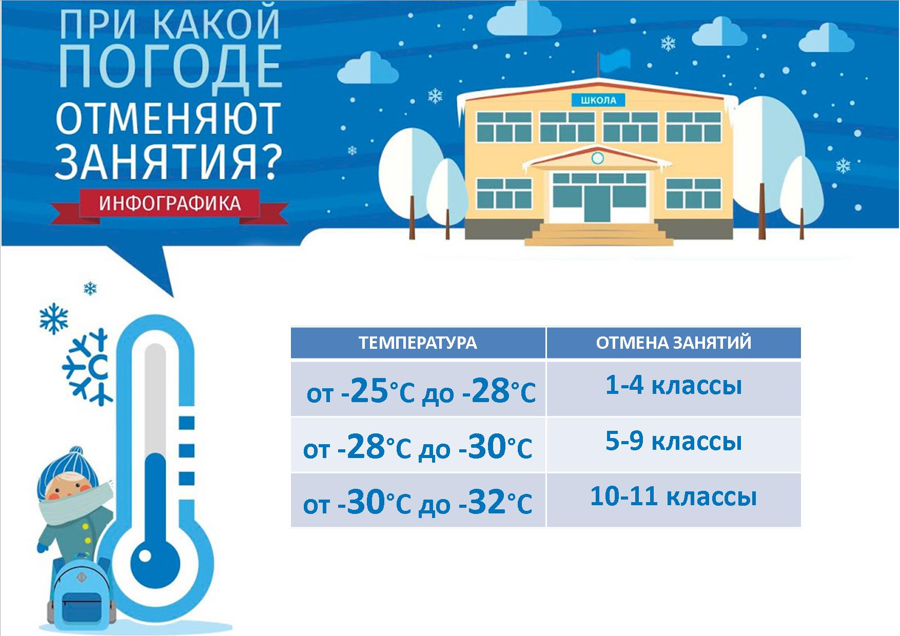 Обучающиеся с 1 по 4 классы могут остаться дома при температуре воздуха -28° без ветра или -25° с ветром не менее 4 м/с.