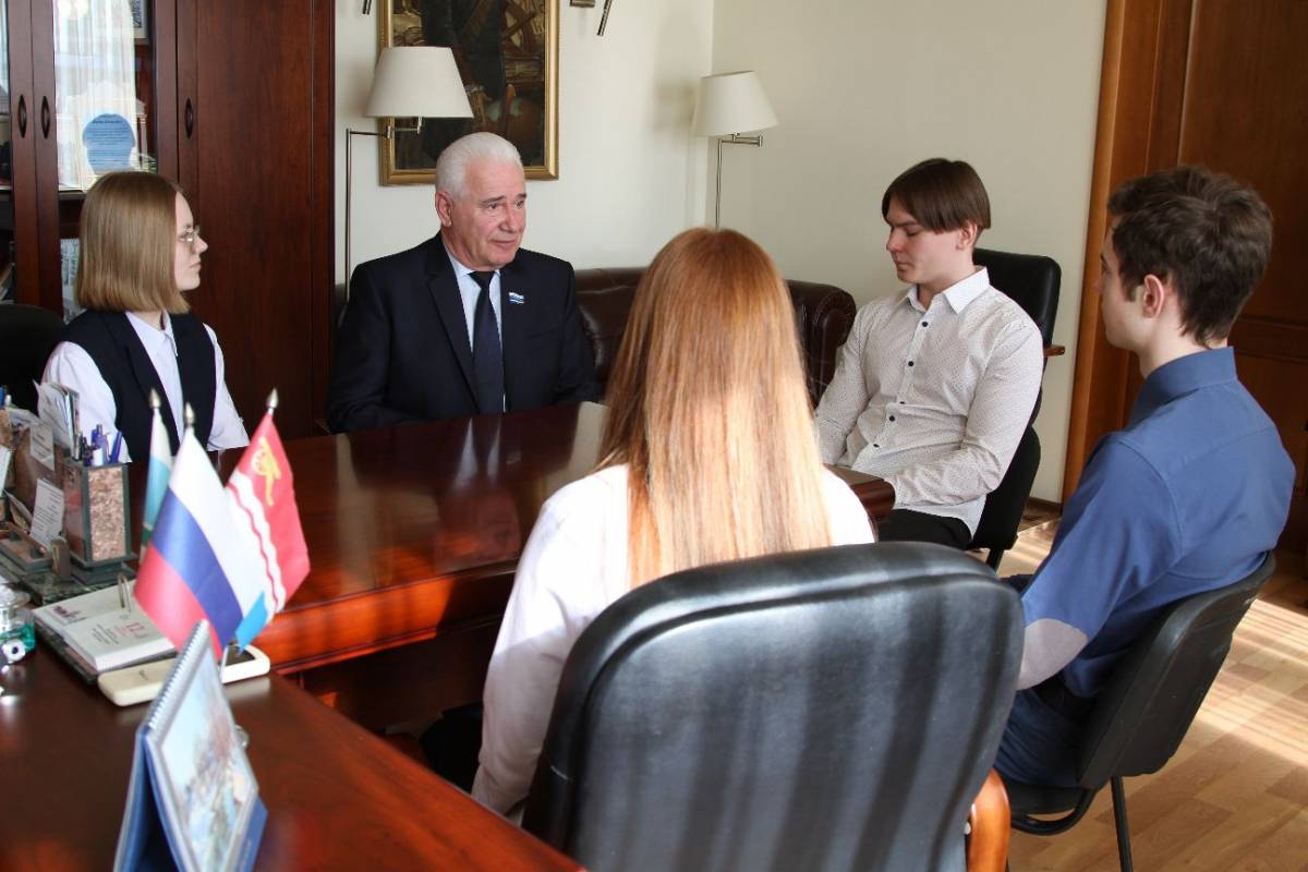 В парламентский центр Виктора Якимова представители школьного самоуправления Кристина Семиволкова, Вероника Букатина, Михаил Федяков и Егор Пинженин пришли с директором школы Натальей Говорухиной и ее заместителем Ольгой Зацепиной. Сообщив о конкурсе, в котором участвует школа, ребята задали вице-спикеру множество вопросов о местном самоуправлении и его становлении в Каменске-Уральском, о роли Виктора Якимова в развитии муниципалитета.