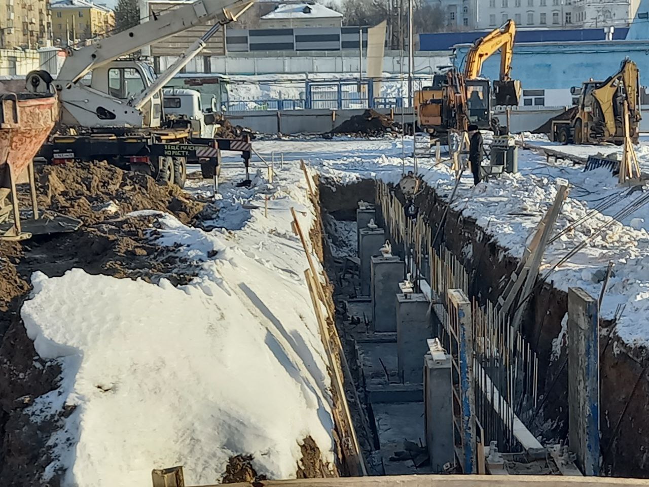 На площадке появилось много тяжелой строительной техники. Продолжаются работы по прокладке сетей теплоснабжения. Подрядная организация приступила к устройству фундамента будущего спортивного объекта.