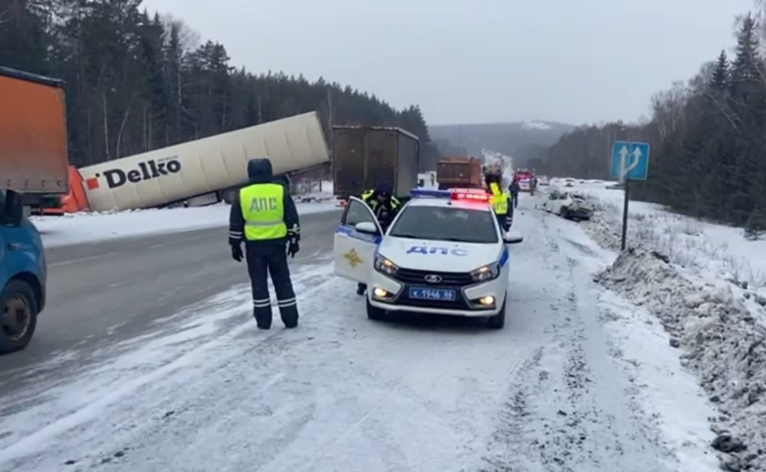 Лоб в лоб столкнулись на 324 км трассы Пермь — Екатеринбург сегодня, 18 февраля, около 7 утра легковая машина и фура. Таксист на Volkswagen Polo вылетел на встречную полосу, по которой ехал длинномер Scania. Водитель легковушки ехал на «докатке» — узком колесе с летней резиной. Такие используют, чтобы доехать до шиномонтажки после повреждения. Об этом рассказали в ГИБДД по Свердловской области.