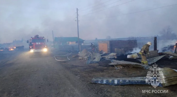 По данным ведомства, 9 апреля в селе Бызово воспламенилась трава, после чего огонь перекинулся на постройки. В результате пожара сгорели несколько жилых домов. В общей сложности огонь уничтожил 11 построек различного назначения на площади 2 000 квадратных метров. Информации о пострадавших нет.