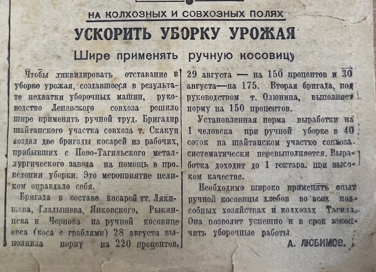 Чтобы скорее собрать урожай, на помощь пришли рабочие и служащие Нижнего Тагила. Тех, кто живет и трудится невдалеке от совхозных и колхозных полей, призывали ежедневно хотя бы на 2 часа выходить в поле, а в выходные устраивать массовые воскресники. Город послал в деревню десятки тысяч домохозяек и школьников старших классов. Уборочных машин не хватало, поэтому приходилось применять ручной труд. Так, на шайтанском участке создали две бригады косарей из рабочих, прибывших на помощь из Ново-Тагильского металлургического завода. Бригада на ручной косовице овса (коса с граблями) выполнила норму на 220%.
