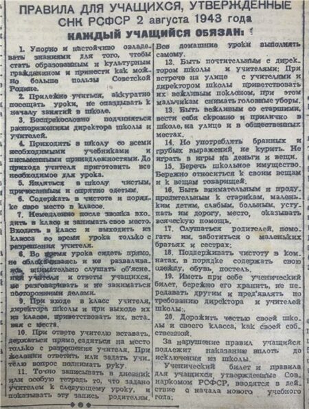 Накануне нового учебного года Совнарком выпускает знаковое для советской школы постановление — Правила для учащихся. По сути, это первый документ времен СССР, обеспечивающий дисциплину детей в учреждениях образования. Готовили его ещё с середины 30-х годов, но окончательно оформили только в разгар войны. Свод состоит из 20 предписаний, нарушение которых может повлечь исключение. Каждый учащийся обязан: