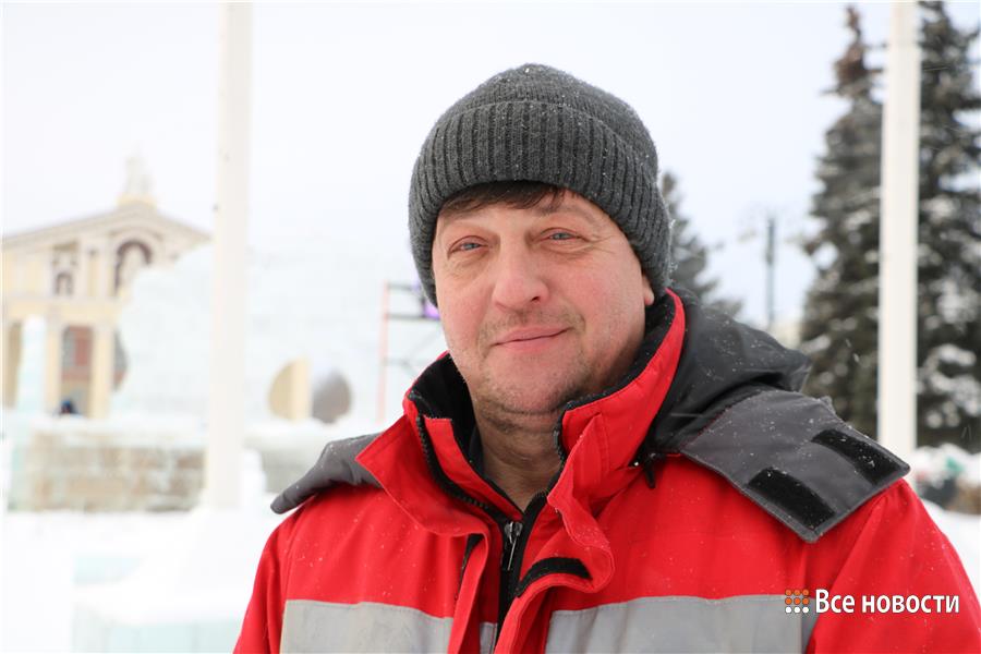 Самый именитый скульптор на площади – Сергей Заплатин из Екатеринбурга. Он работал во многих странах, победитель чемпионатов мира и Европы по ледовой скульптуре. Известный не только в России, но и за ее пределами, Сергей Заплатин вырезает ключевые фигуры ледового городка. Совсем недавно вернулся из Нового Уренгоя с конкурса ледовой скульптуры «Горячий лед», где представил работу «Энергия севера». Для этого человека ледовая скульптура давно стала профессией.