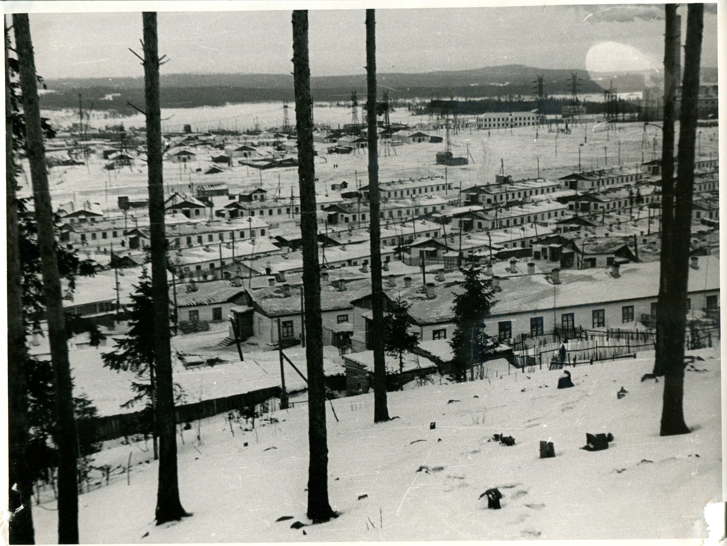 Вид с горы Шайтан на барачный поселок строителей Нижнетуринской электростанции, конец 1940-х – начало 1950-х годов.