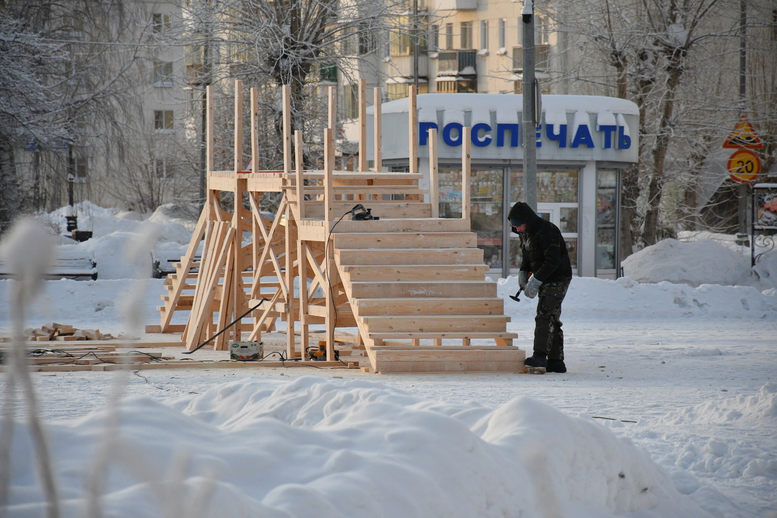 В центре Краснотурьинска продолжает работать бригада подрядной организации, которая занимается строительством главного новогоднего городка. Мужчины практически закончили монтаж деревянных горок для катания.