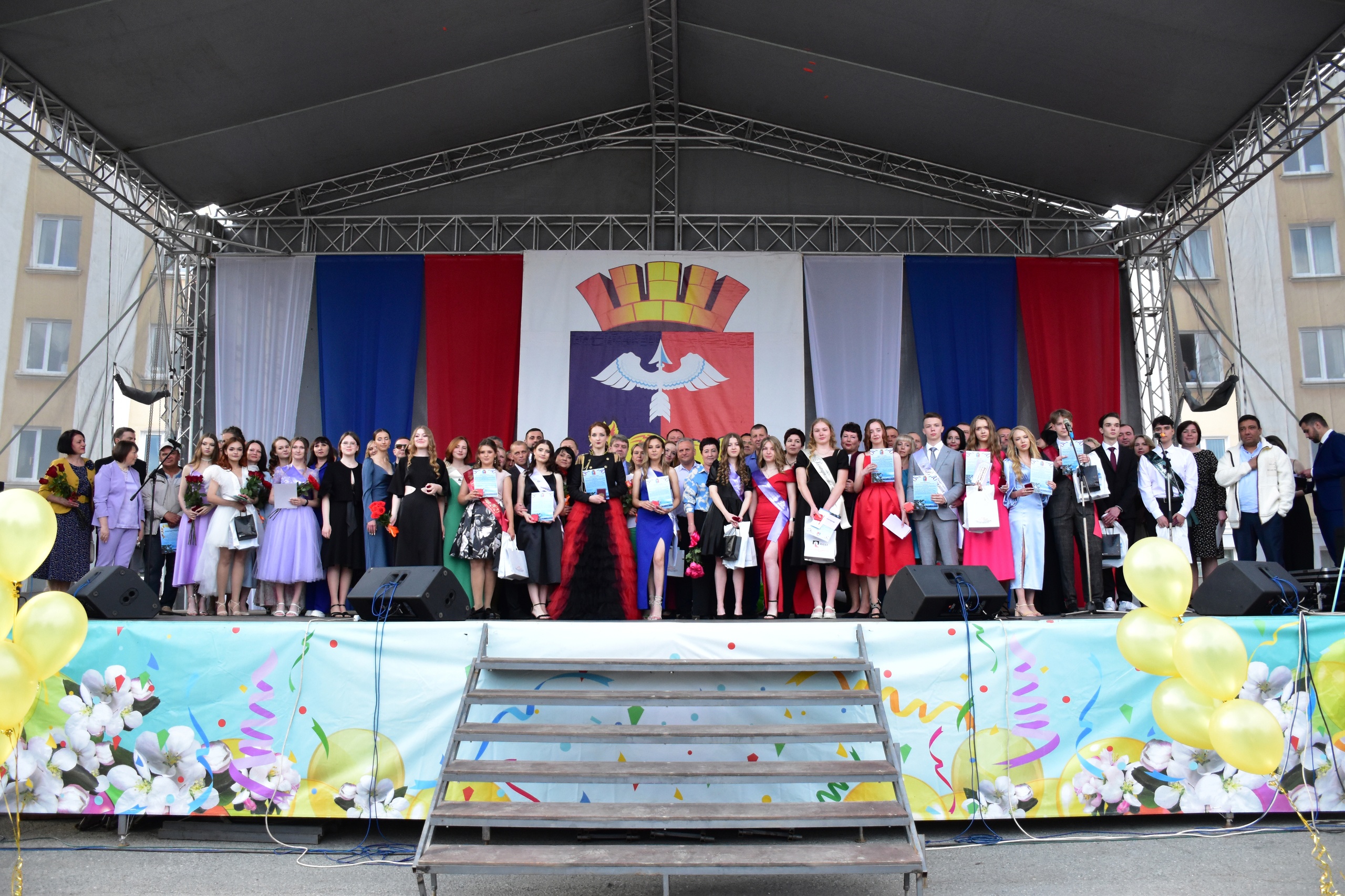 После ставшего уже традиционным шествия выпускников школ города от улицы Ленинского Комсомола до центральной площади, на сцене перед городской администрацией началось торжественное мероприятие, посвященное окончанию средней школы, а также вручение дипломов с отличием студентам местных средних специальных учебных заведений.