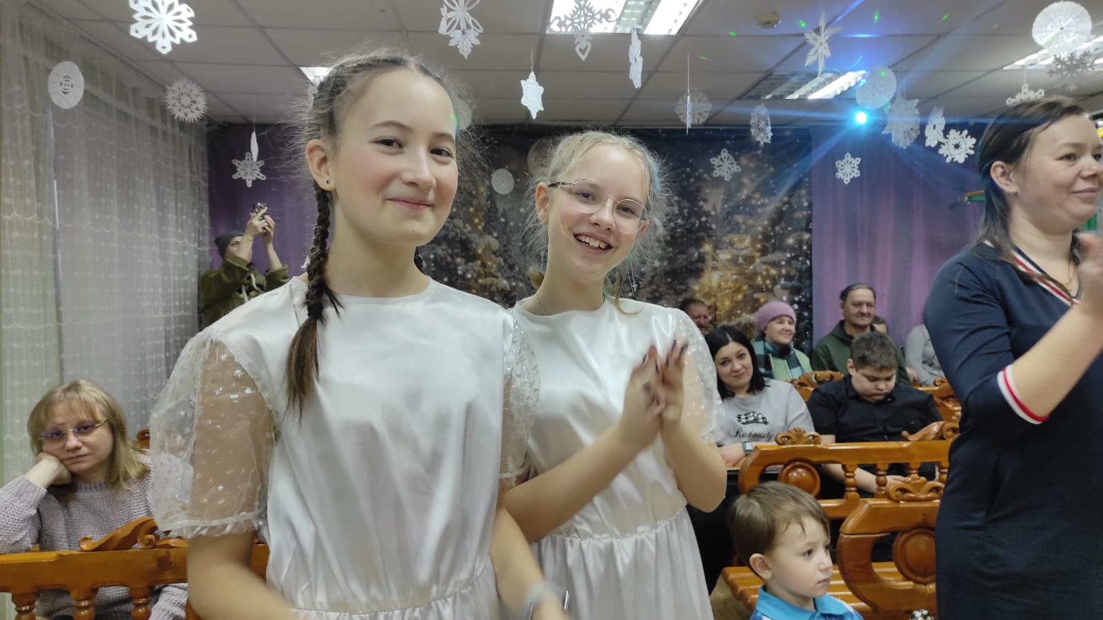 Завершился рождественский рассказ счастливым воссоединением семей, что стало кульминацией спектакля. Повествование было настолько душевным и трогательным, что многие малыши обняли своих бабушек. После спектакля дети водили хороводы возле ёлки с Дедом Морозом и Снегурочкой.