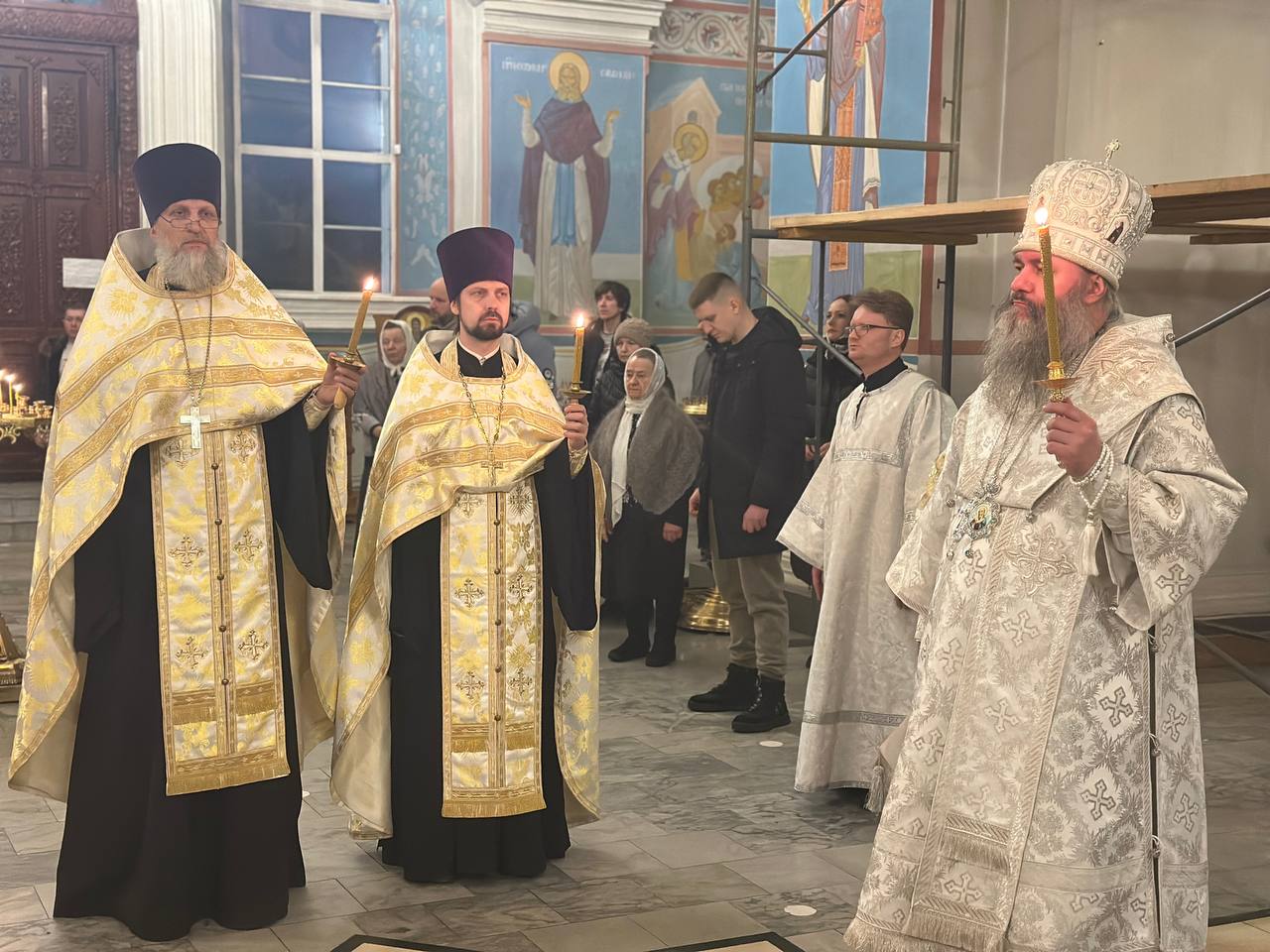 Его Преосвященству сослужили руководитель Административного секретариата иерей Григорий Елохин и клирики собора: иерей Николай Иванов и иерей Константин Столов.