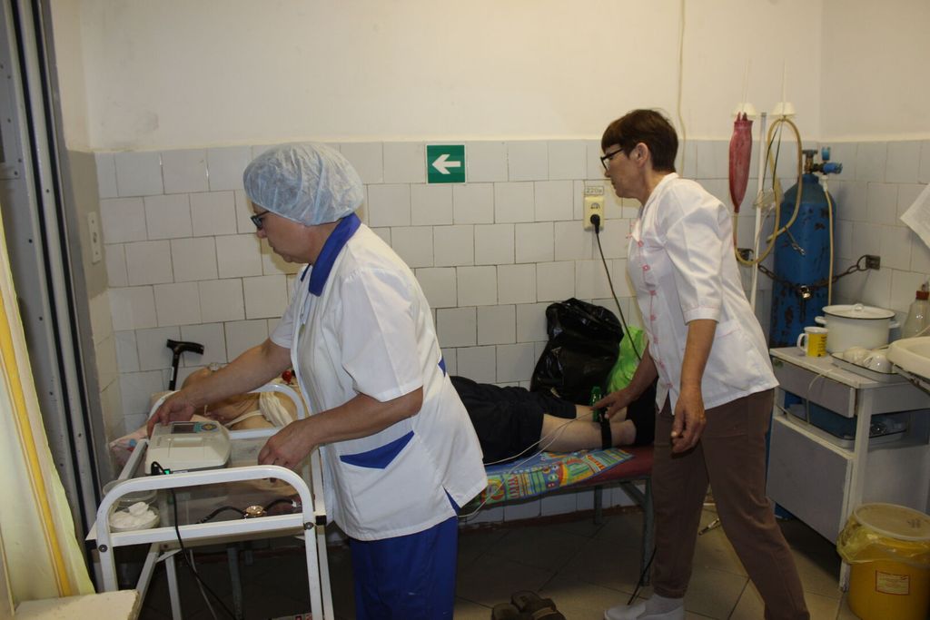 Н.В. Малышкина и С.И. Колесникова готовят вновь поступившего пациента к ЭКГ.
