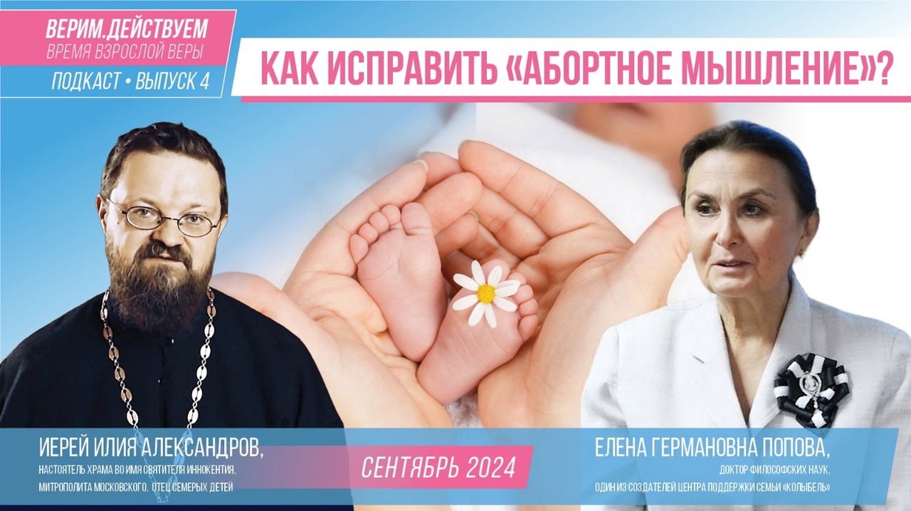 Чем опасно «абортное» мышление, как оно влияет на нашу жизнь и что с этим делать – поиску ответов на эти вопросы был посвящен новый выпуск медиапроекта «Верим. Действуем». Его гостями стали настоятель храма во имя святителя Иннокентия, митрополита Московского, многодетный отец иерей Илья Александров и одна из создателей центра поддержки семьи «Колыбель», доцент Уральского федерального университета, кандидат философских наук Елена Германовна Попова.