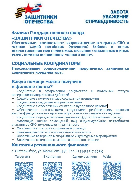 Филиал Государственного фонда «ЗАЩИТНИКИ ОТЕЧЕСТВА» Обеспечивает комплексное сопровождение ветеранов СВО и членов семей погибших (умерших) бойцов в целях предоставления мер поддержки, оказания социальных и иных услуг, помощи по принципу «одного окна».