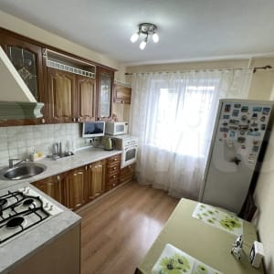 В квартире остаётся: качественный кухонный гарнитур, духовой встроенный шкаф, газовая поверхность, вытяжка, кухонный стол, спальный гарнитур, диван, стенка в гостиной, люстры, шторы.